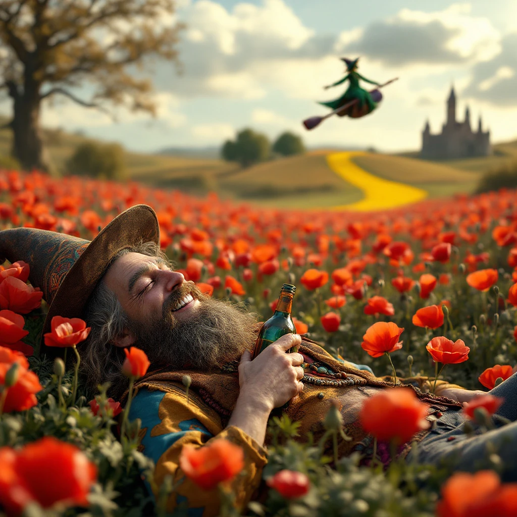 a totally wasted hippie with a dopey grin partly closed eyes is in a field of poppies laying prone on ground and talking a wizard next him, who is holding a bottle in front of him. the horizon has a yellow brick road leading to a castle in the distance, in the sky is a evil green witch flying on a hoover vacuum, trending on artstation , daz3d, cinema 3d, camera at a dynamic angle
