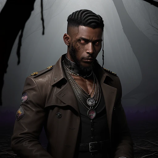 A black man, with short fade and line in hair, in a torn, government issued, blood stained trench coat, with a leather braided necklace with a single eyeball in the center of the necklace sways from around his neck. Gazing across a stirring, bubbling swamp at Ravens nest deep in the background. Ravens Nest, a dark castle, built of dead trees and glowing caverns. Magic the gathering, clouds of leaves and wind, in spiral of leaves in giant ancient tree background, Ominous intricate, gorgeous pose, ArtStation, Unreal Engine, intense lighting, intense shadows, orthodox symbolism, concept art, ambient, magic realism, orthodox symbolism, ambient occlusion, volumetric lighting, emotional, 8k resolution, tribal dark fantasy --ar 3:2