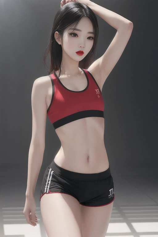 (1girl) , (full body) , Beautiful Korean girl, kpop idol, (wearing a cropped jacket, sports bra, running shorts) , (red lips) , (small breasts) , (toned stomach) , dramatic lighting, (photo realism:1.4) , symmetrical eyes, (aegyo sal:1) , (eyelashes:1.1) , (beautifully detailed face, beautiful detailed eyes) , realistic, sharp focus, HD, highly detailed, intricate, photography, hyperrealism, hyperrealistic, raytracing, physics-based rendering