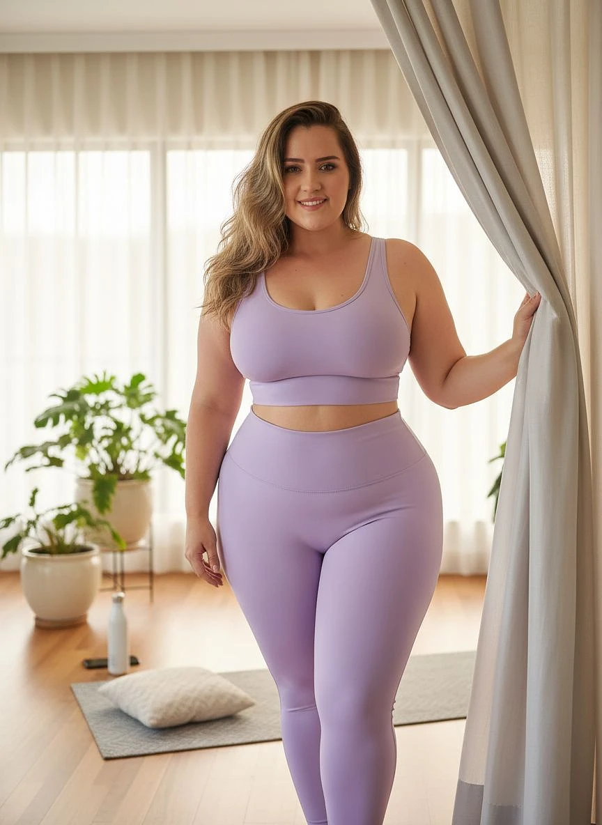 A photorealistic image of a stunning and curvaceous 21-year-old woman with glowing skin, long wavy hair, and captivating eyes. She stands hidden behind a silky curtain in a luxurious room filled with natural light. The image captures the moment she drops the curtain to reveal a sleek, form-fitting yoga outfit—a matching sports bra and high-waisted leggings in a soft pastel color that hugs her voluptuous curves, emphasizing her ample chest, narrow waist, and rounded hips. The background features lush indoor plants, a plush yoga mat, and warm sunlight streaming through large windows. Shot with a Canon EOS 5D Mark IV and a 50mm lens, the scene is illuminated by soft, diffused lighting with sharp details, cinematic depth, and rendered in 4K resolution.