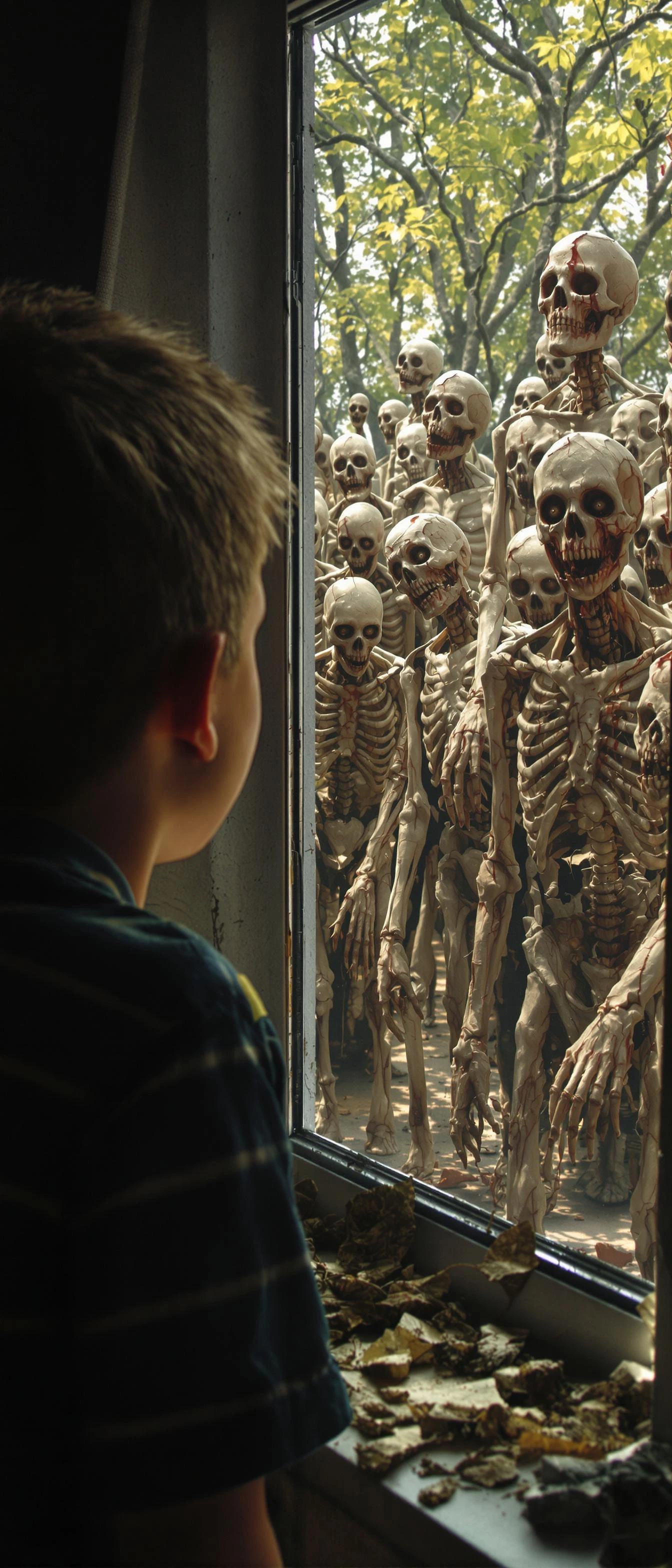 A boy looking from a window at daylight and sees many walking dead people . Their body are fleshy or half fleshy . Some bodies have skin intact . Some bodeis are semi skeleton and semi fleshy . Their body are exposed . Hyperrealistic. Hyper details . Hyper face and body details . 8k . High quality .
