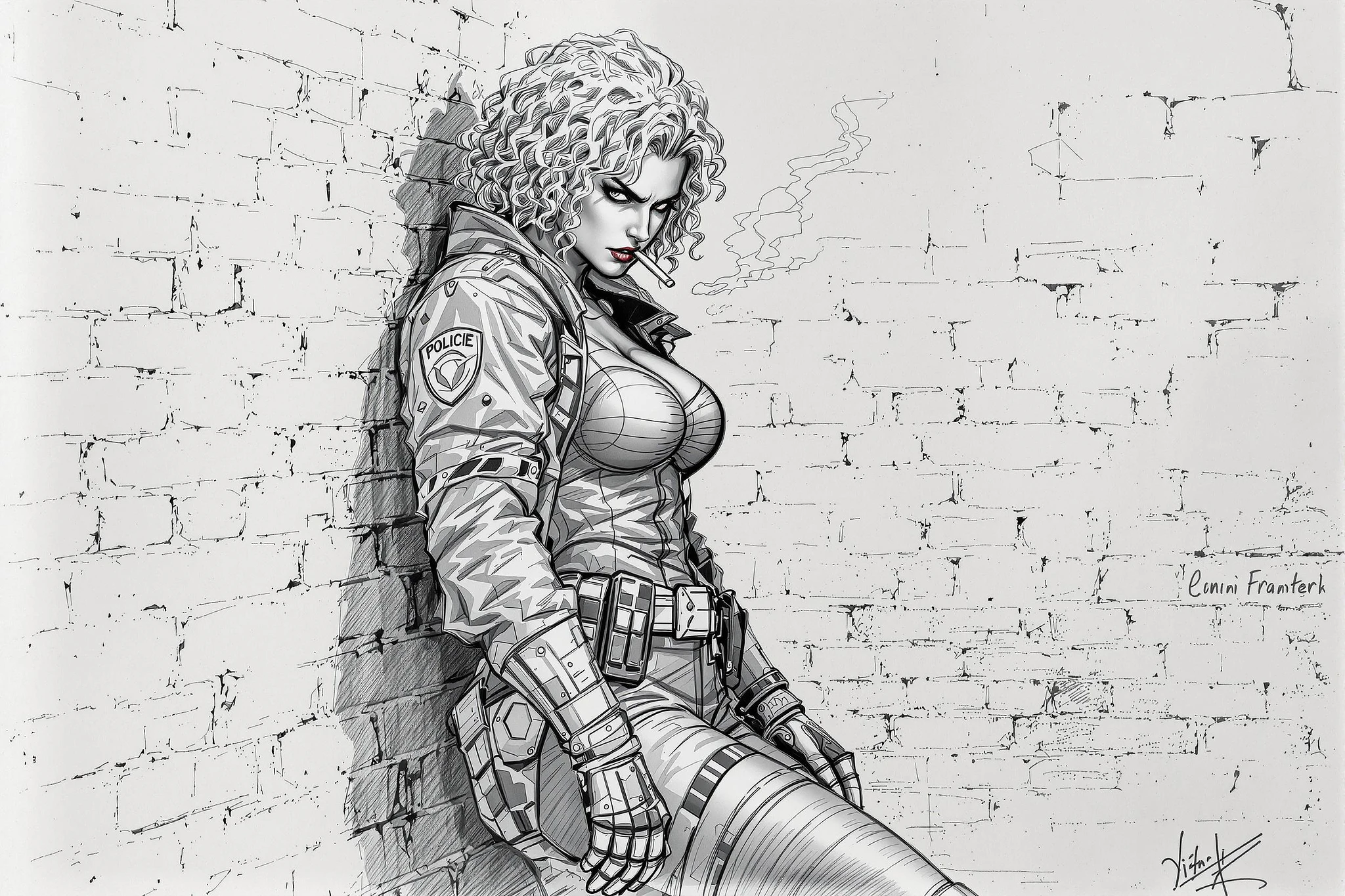 A very well done pencil sketch of a full body cyberpunk female character, around the age of 20 leaning against a brick wall smoking a cigarette and looking away from the camera. They have an angry face. They should be wearing a police outfit and heavy boots and their hair is reminiscent of makima from Chainsaw man, but curly hair. like malin akerman as laurie jupiter