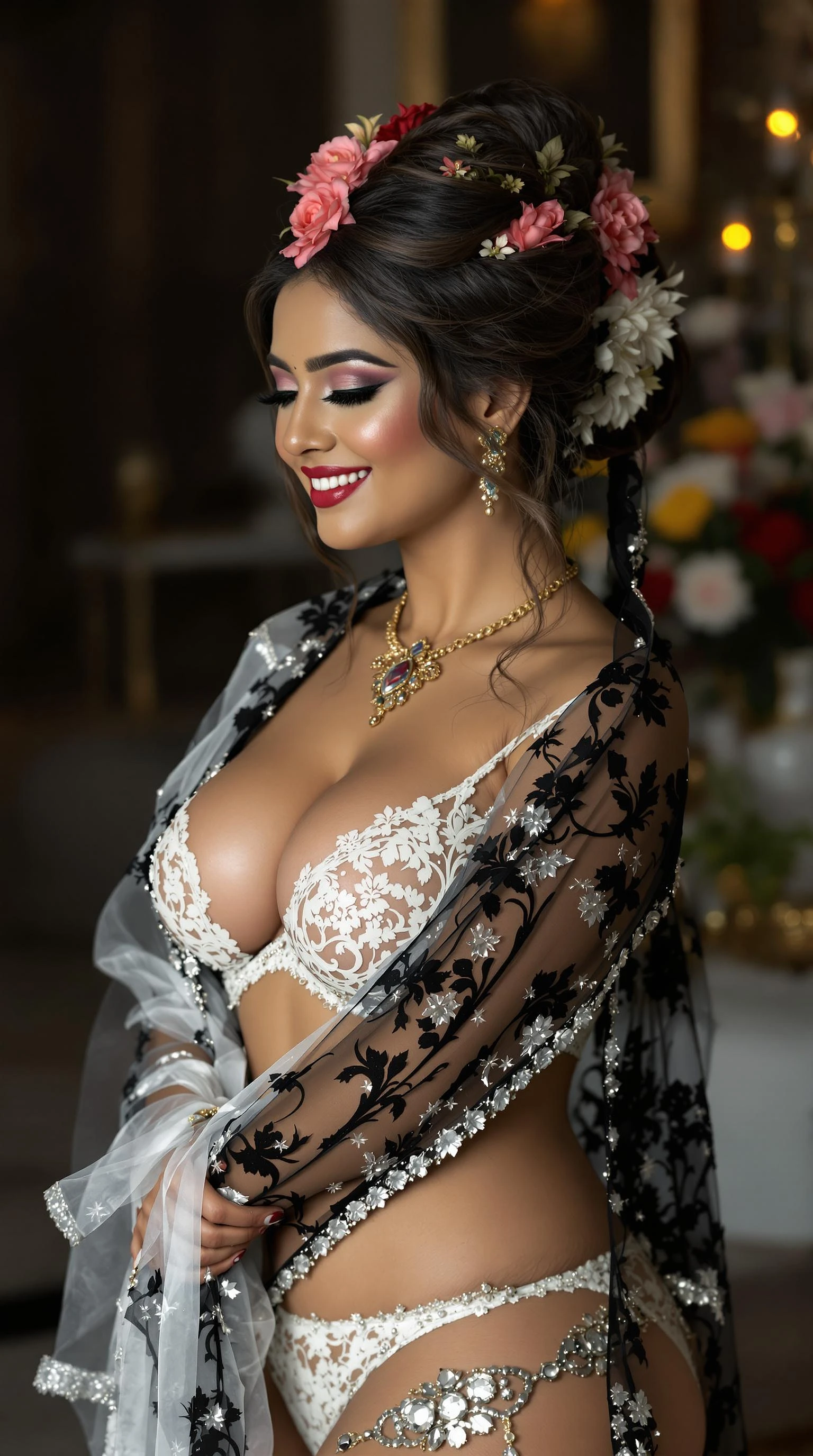 a full side front view large puffy boobs legs with high heels matched color cleavage realistic looking Sexy Indian slightly plus size sexy white Indian woman with sexy smiley face a Indian hot and sexy standing on her front cleavage she is with transparent black and white very thin transparent scarf on boobs see through rear of bra and tiny while panty heart capture the delicate contours of her face and the intricate details of her classic hair style black vibrant colors to capture the intensity of the flowers, her hairs styles Gorgeous Cupcake Hued Bun-Style Bridal Hairstyle, she is laughing out loud sexy, she is looking at her back with smiles
