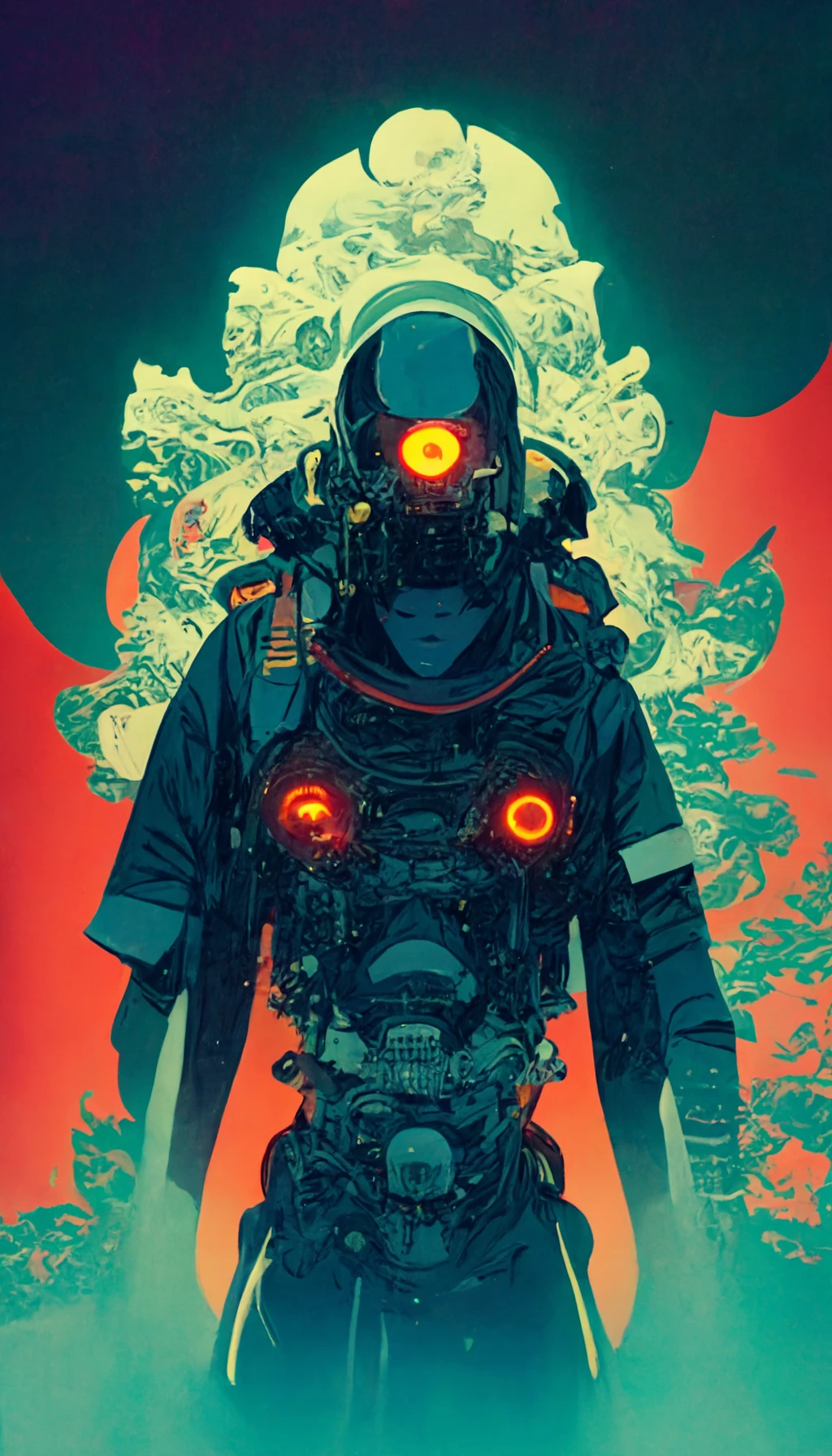 the cybernetic raven man with 3 iridescent eyes. ghilbi, akira, ghost in the shell, 2077, style of Laurie Greasley and Satoshi Kon + symmetric lights and smoke, psychedelic neon effects , white back ground, clean room, bold shūji, glowing particles, neon rain, glowing runes, de-noise, symmetrical composition, high detailed + tarot card, ornate border, 8k, --w 1152 --h 2048 --s 5000 --q 2 --uplight
