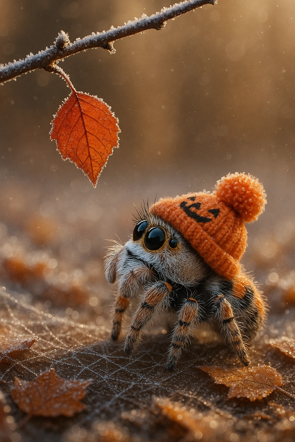 fluffy little spider in a knitted hat with a pompom, sitting and looking up at a single leaf hanging on a branch, huge eyes with eyelashes, thoughtfully on the web, frost, frost glitter all around, fallen leaves, looking at the last leaf , side view, glitter, beautiful, nature atmospheric, macro photography, professional photo, 8k, high resolution, high detail. A white black and orange jumping spider with an orange jack-o’-lantern knit hat on looking up at a red leaf in autumn