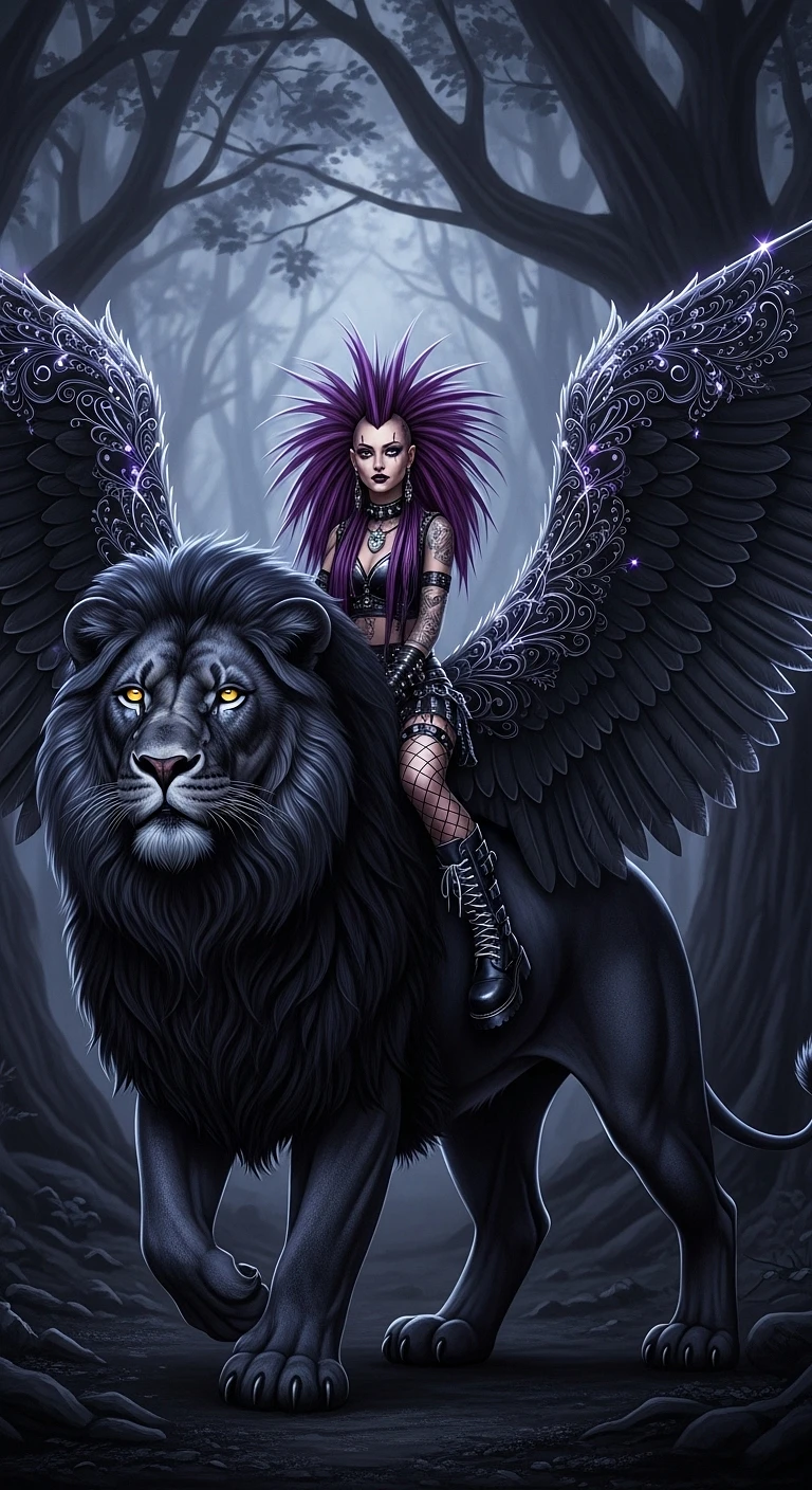 A full body shot of a strong, fierce black lion with slight blue tinge to its fur and large outstretched transparent-black feathery wings with intricate glowing filigree details. A punk rock woman with long flowing deep purple hair wearing combat boots and gothic style clothic with fishnet detailing and dark bold makeup sits on its back. Dark, moody, forest backdrop, large shadowy trees. Highly-detailed, photo-realistic, symetrical hyperdetailed texture, pearl filigree, deep violet, concept art, DeviantArt, perfect composition, masterpiece, glittering, professional photography, dramatic lighting, 8k, sharp focus, ethereal, dark fantasy, moody lighting