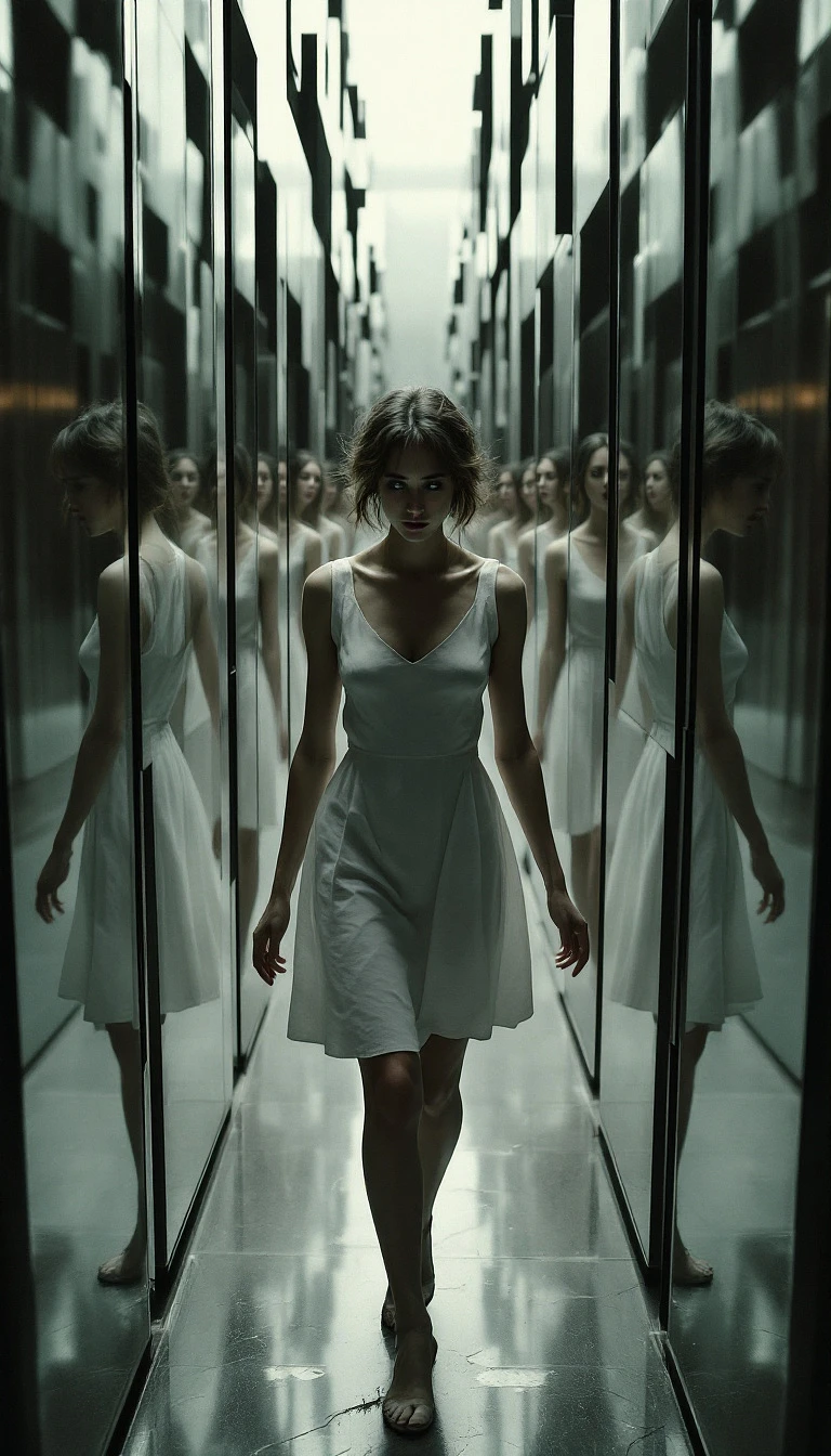 4. A poignant, full-body reflection of a woman navigating a labyrinth of mirrors, each reflecting a distorted version of her past, present, and future, blurring the lines between reality and perception. She wears a simple, white dress, her expression a mix of confusion and curiosity. The style combines the fragmented perspective of cubism with the surreal themes of identity and memory.