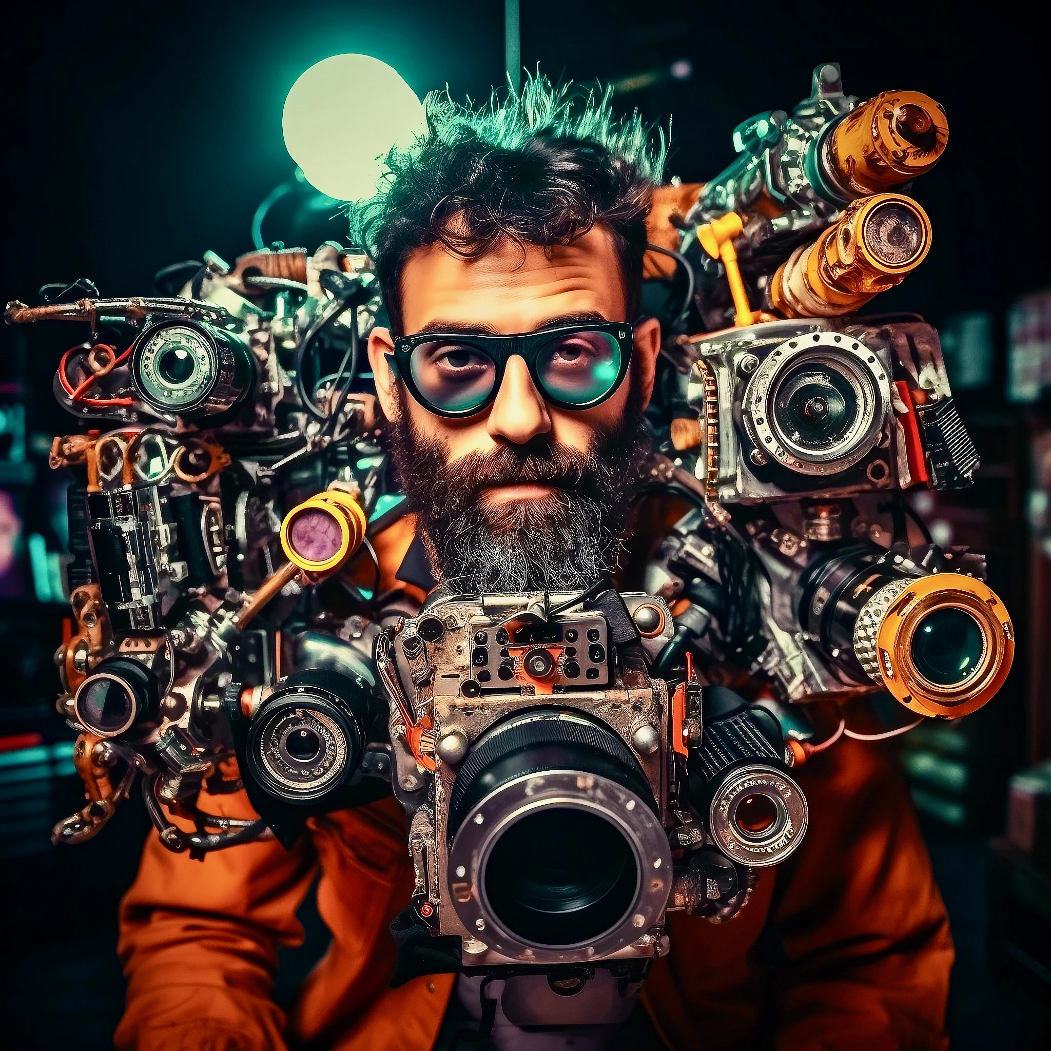 medium shot of a cyberpunk cool cameraman operating a funky crazy abstract cinematic old fashioned movie camera with a long zoom lens and viewfinder and large 35mm film magazines, lots of nuts bolts and levers, high resolution, fine details, dramatic lighting, ultra realistic, bright and cheerful atmosphere