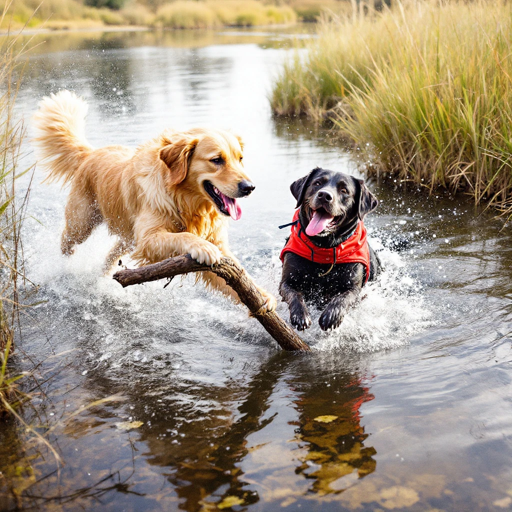 A golden retriever and a Black Lab jumping into a pond to retrieve a stick