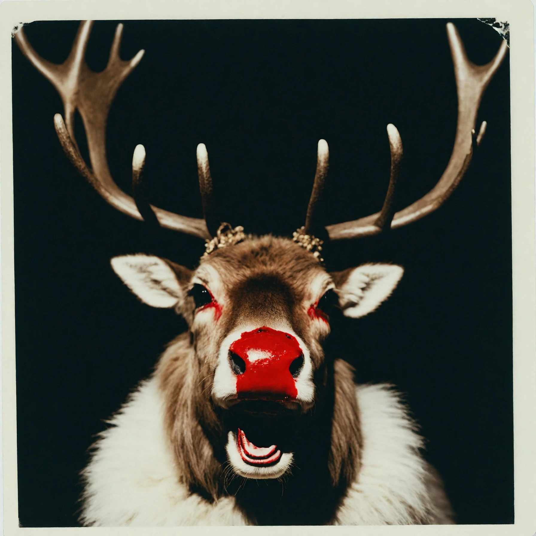 A disturbing polaroid picture of an evil Rudolph the reindeer with a bloody nose, (((by robert eggers) )), close up, deadpan, evil stare, deep shadows, (((highly unsettling) )), hyper-realistic, small details, (perfect eyes) , gritty, scary christmas aesthetic, absolutely frightening, haunting image, scary image, pure evil, extremely creepy