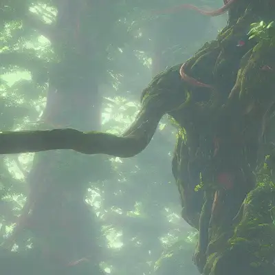 elephant, exotic toxic forest, large tall trunks trees, hanging vines, moss by Miyazaki, Nausicaa Ghibli, Breath of The Wild --ar 10:20