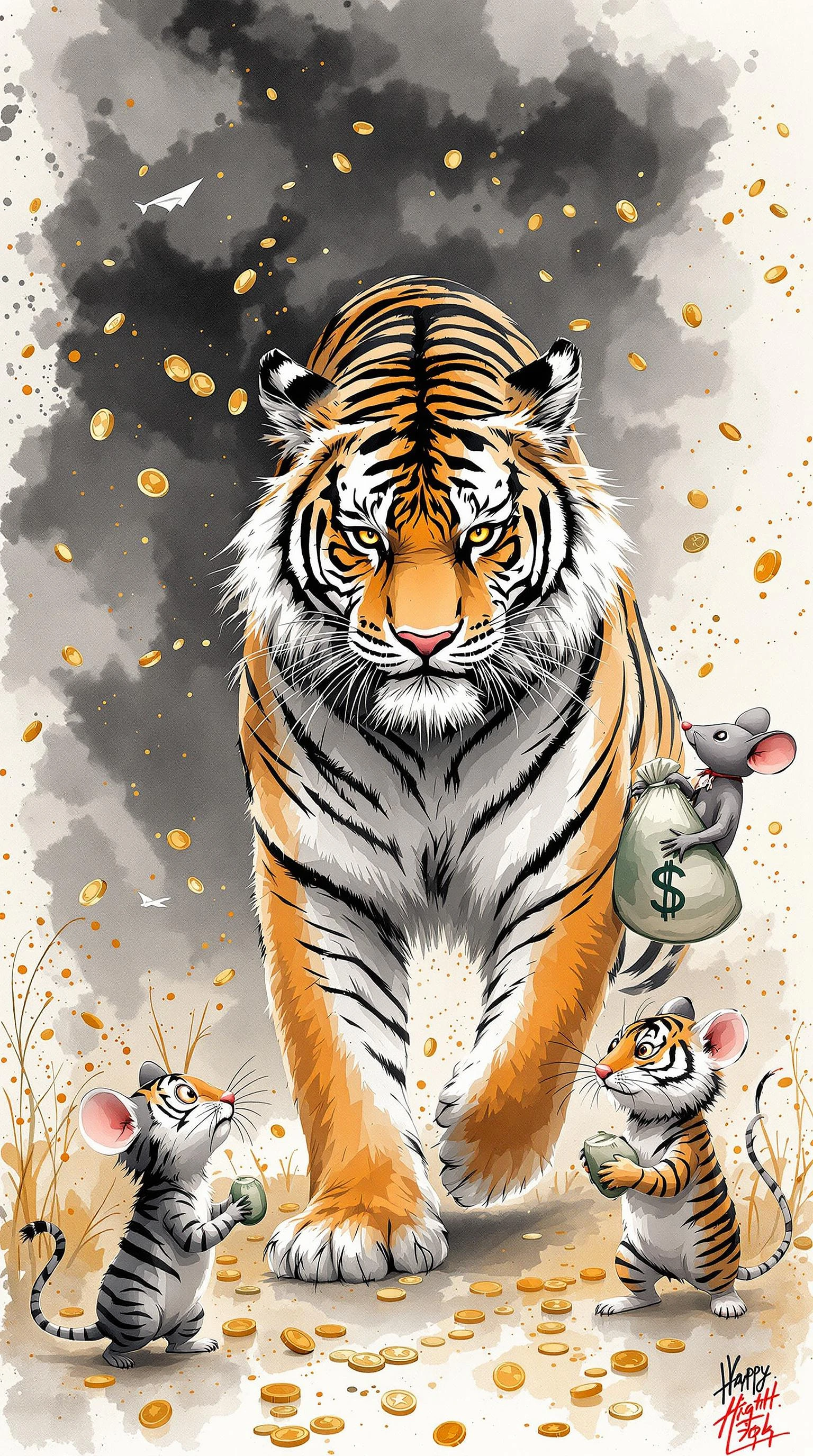 A big tiger and two little tigers, the tiger holding a money bag,In the background, a rat controls a tiger, The background is a big mouse's shadow, blending in with the background. blending with the background, in a transparent,watercolor style, featuring splashes of ink and an ink wash style, with splattered ink dots, scattered copper coins and gold beans in the background, paper airplanes in the background, ink splashes above, rich in details, the tiger is the main subject, ink swirling around its body, in an ink wash style,masterpiece, best quality, original, wallpaper, colorful, covr, everyone, gradient_background, huge_filesize, highres, traditional_media, fine_art_parody, head tilt, ink style,watercolor, masterpiece, best quality, in a meadow, walking, Stay to the right,