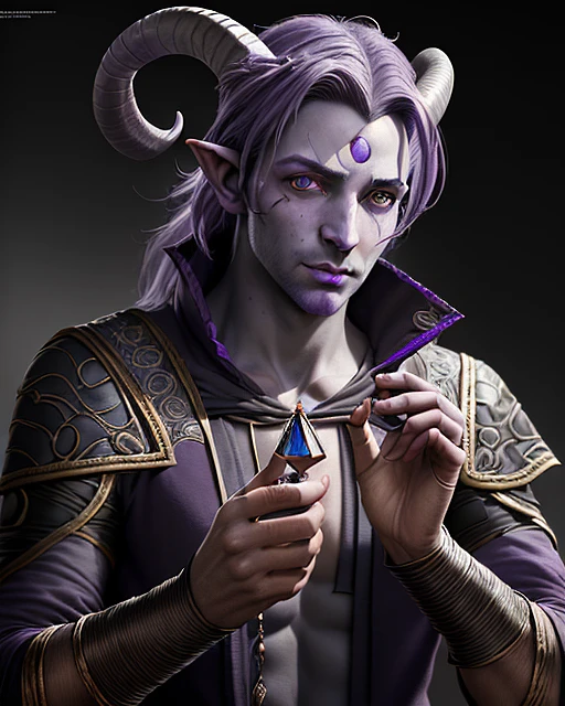 portrait painting of male magical tiefling rogue thief with lavender skintone and ram horns on the forehead and holding a gemstone in his hands, ultra realistic, concept art, intricate details, eerie, highly detailed, photorealistic, octane render, 8 k, unreal engine. art by artgerm and greg rutkowski and charlie bowater and magali villeneuve and alphonse mucha