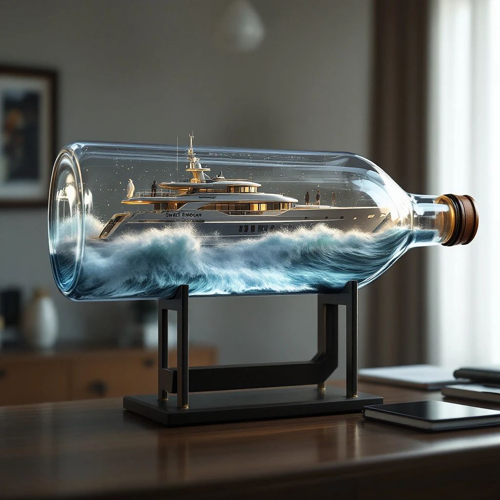 A realistic ship in a bottle, featuring a ((2005 76-foot Lazarra enclosed fly bridge) ) luxury super yacht scene. The yacht is busy with a few people on deck. The yacht name "Sweet Emoean" is visible on the side. The scene includes cresting waves, capturing a vibrant, dynamic moment. The bottle sits on a stand as a decoration on a professional-looking desk in a well-appointed home office. Highly detailed, ultra-realistic, cinematic, 8k. Negative prompt: text, logos, watermarks, out of frame, ugly, extra limbs, extra hands, extra feet, extra fingers, bad anatomy,