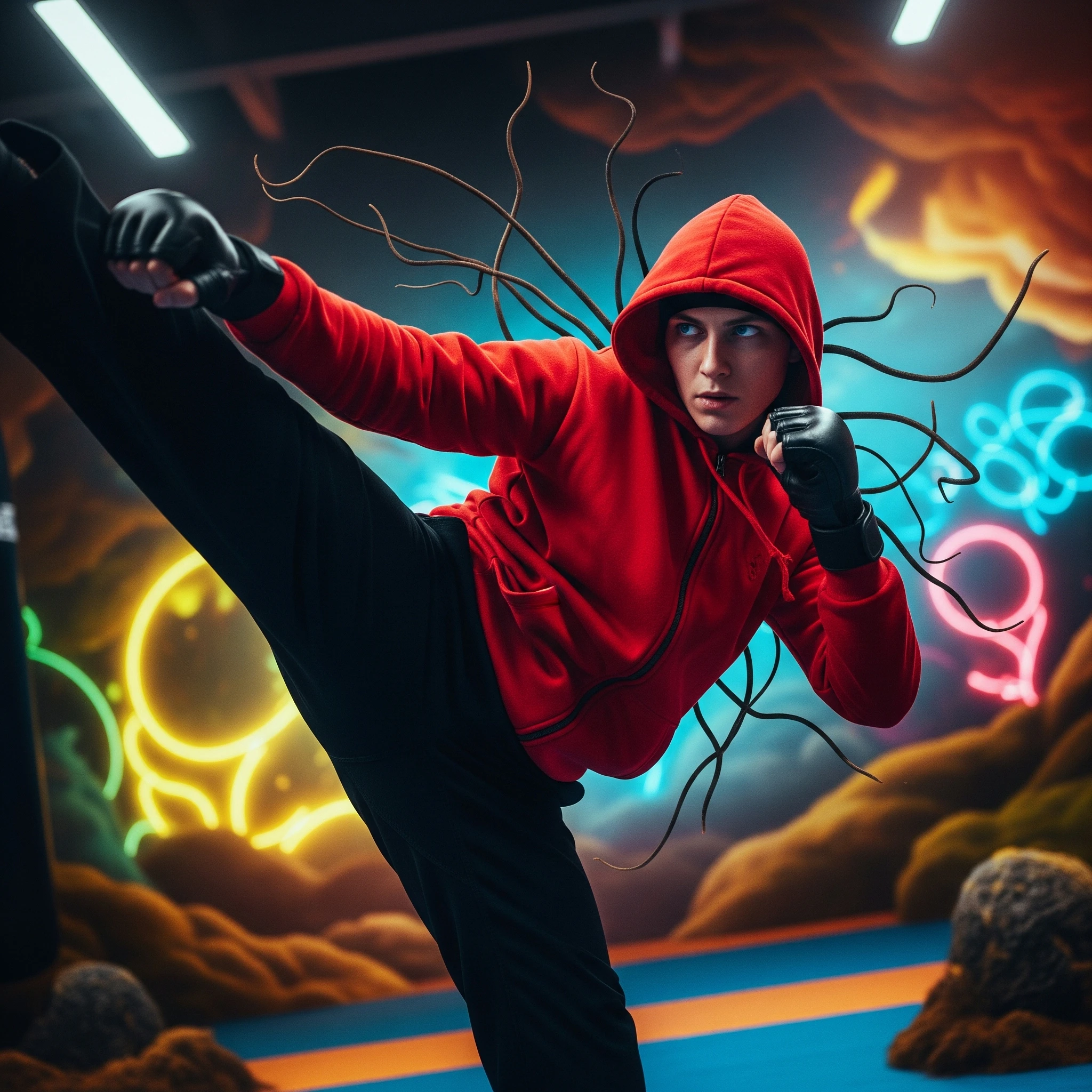 A figure in a striking red hooded sweatshirt and black trousers, with dark gloves, throws a dynamic karate kick in a dimly lit dojo. The face is sharp and focused, with piercing blue eyes that express determination. Thin, dark, organic tendrils emerge from behind their shoulders and arms, intertwining with the motion of the kick. The background is a colorful, surreal environment featuring abstract organic shapes and a striking mix of bright fluorescent and earthy deep tones, giving a sense of mystery and otherworldly presence. The shot is taken in a low angle, emphasizing the figure's powerful stance and creating a dynamic tension. The style is an image reminiscent of a modern martial art film, with a powerful, sharp style, using a high-quality camera to capture the energy and detail of the scene.