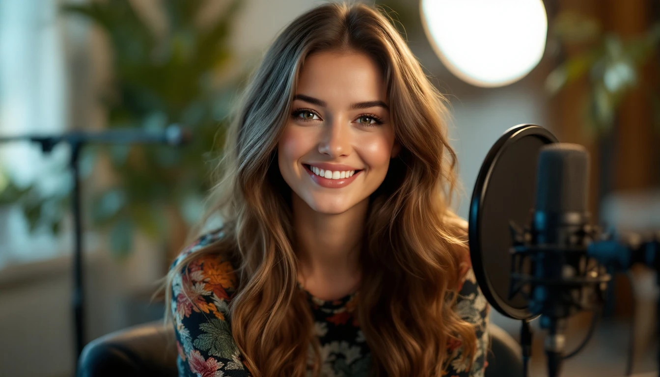 Portrait of a beautiful young woman with wavy long hair, studio lighting, DSLR-style shot, soft focus, glowing skin, depth of field, seated in a podcast setup, cinematic color grading, ultra-realistic, 4K