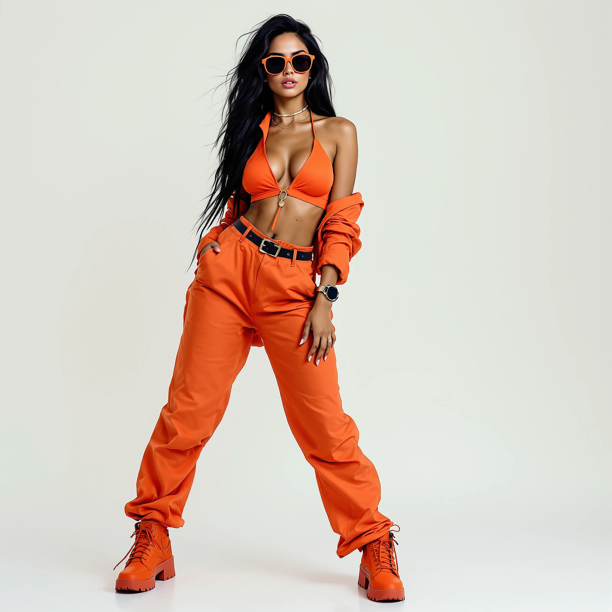 latina badass female model, tanned skin, brown latin skin, with sunglasses and orange urban clothes stand pose. full view portrait, see full body legs and feetand extrem long black hair