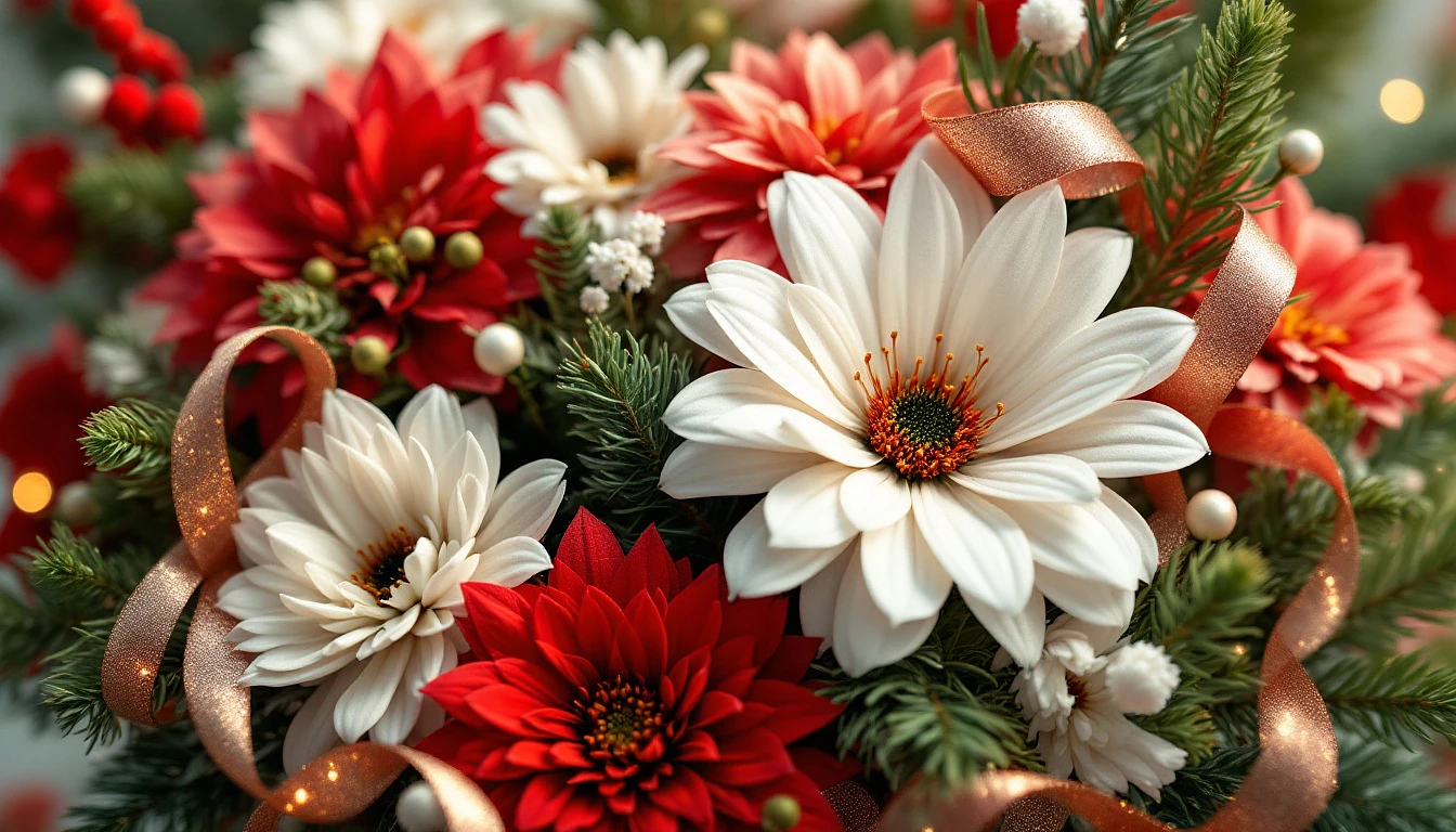 Imagine a minimalist abstract, with 3D metallic tones for Christmas, featuring a bouquet in white, green, and bright red candy cane colors. This display includes hybrid flowers with long, slim, curly petals, accompanied by mums and poinsettias. Pine sprigs, highlighted by large, curly, glittering ribbons of random colors, complete the arrangement, all against a glowing festive background with a macro close-up of the flowers, fostering an abstract sense of peace and calm.