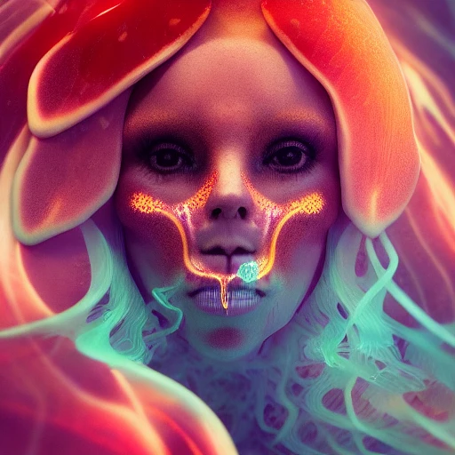 Goddess close-up portrait ribcagel. jellyfish phoenix head, nautilus, orchid, skull, betta fish, bioluminiscent creatures, intricate artwork . octane render, trending on artstation, t symmetrical artwork. cinematic, hyper realism, high detail, octane render, 8k
