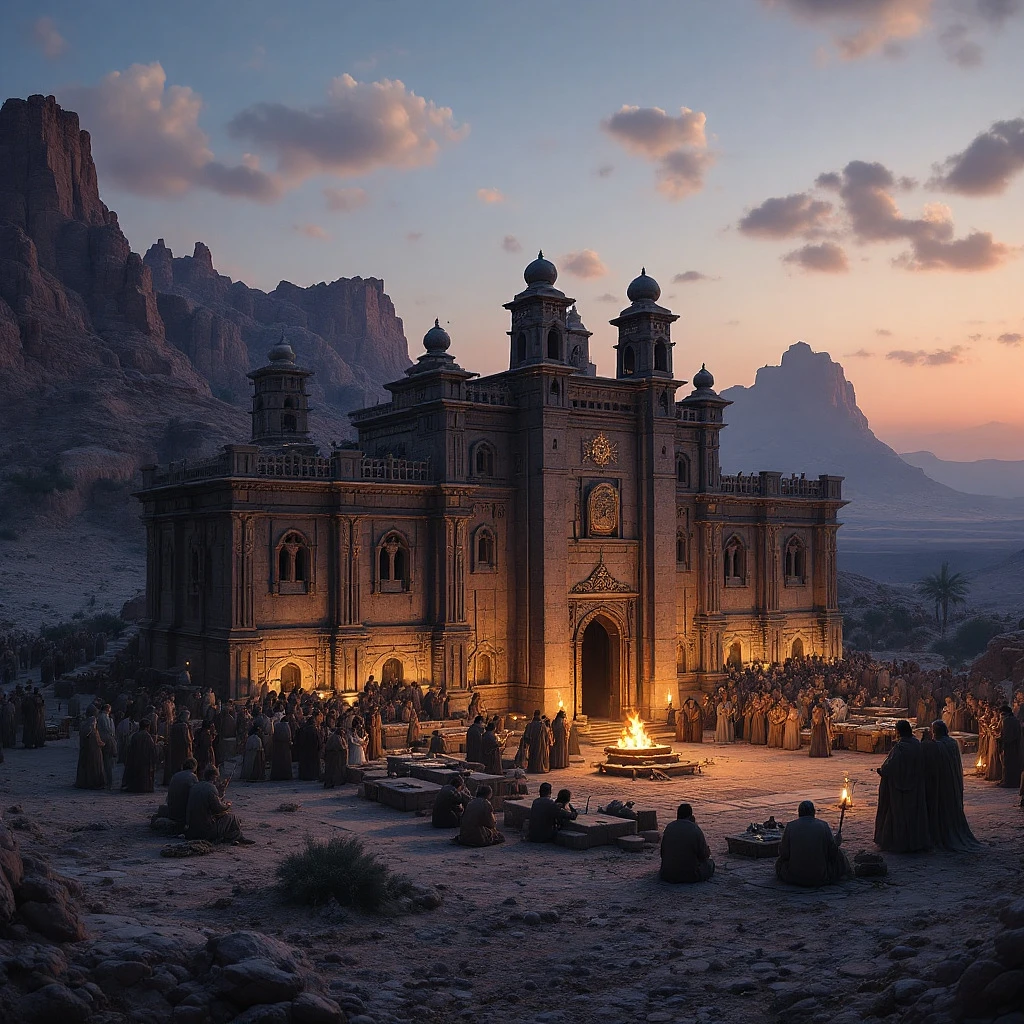In the book of exodus in the Bible there is a tabernacle of congregation being built by Moses where the High Priest minister with the priests, i need a 4k image of it, real and detailed, dusk atmosphere, detailing the various things present in it, in the ancient time
