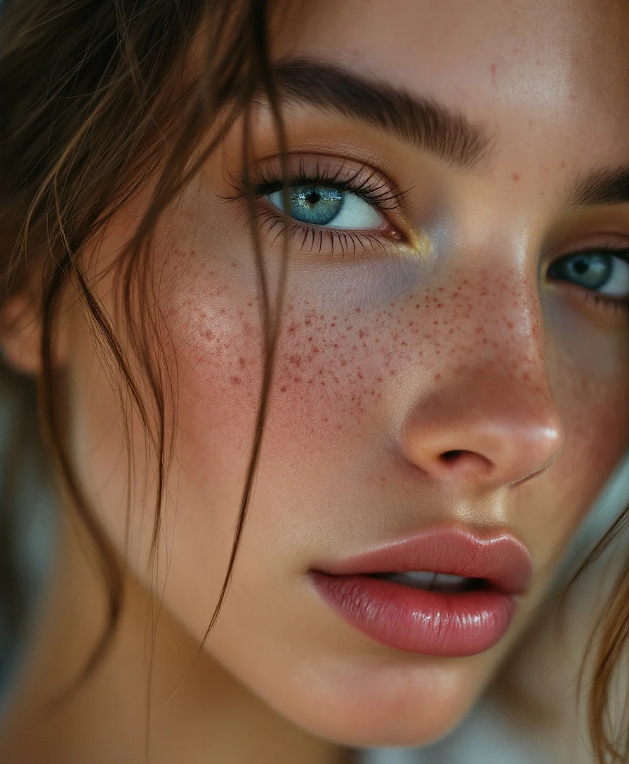 close-up of a stunning fashion model with freckles, ultra-realistic, portrait, shot on a Sony A7III, high quality --ar 35:64 --stylize 250