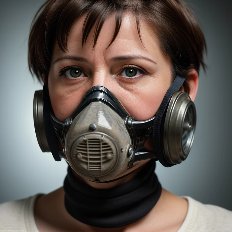 hyper realistic headshot photo of a 50 year old woman, wearing a gas mask, short hair, Extreme Close-Ups, Full Frame camera, ISO: 100, Aperture (f-stop) : f/1. 8, Shutter Speed: 1/30, Camera Lens: 85mm prime lens, Camera Eye Line: Low, Studio Lightning