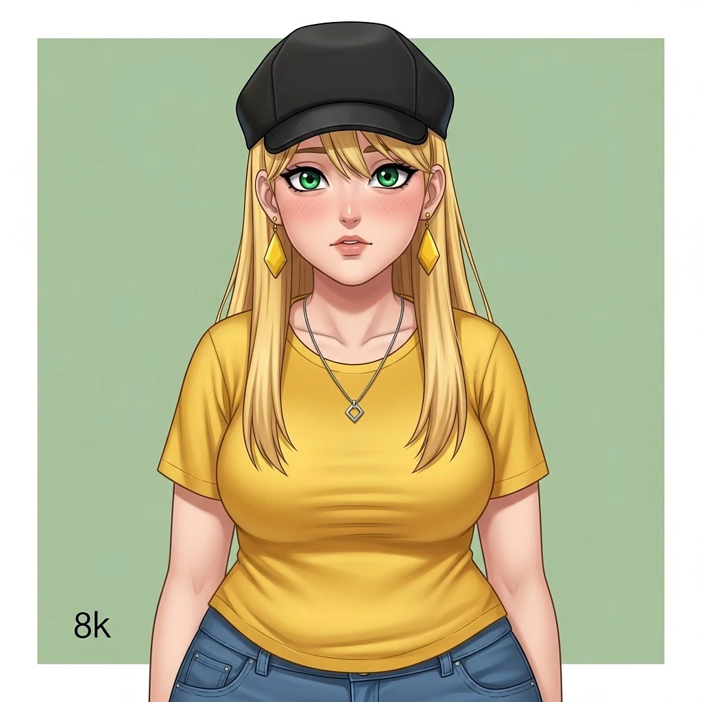 1girl, upper body, (dark simple yellow cap:1.3) , a character portrait, trending on Artstation, digital art, (pokemon trainer outfit:0.8) , render of a (3d:0.8) (anime:0.9) girl, Long hair, Straight hair, Sunburst yellow hair, (Swept bangs:1.3) , a beautiful artwork illustration, highly detailed, (cartoon style illustration:0.8) , (v sign:1.3) , 8k, almond green background, dark banana yellow shirt, dark emerald green eyes, simple design clothes, (simple clothes:1.3) , jeans, 20 years old, matured, weight gained, golden earrings, silver simple necklace, embarrassed