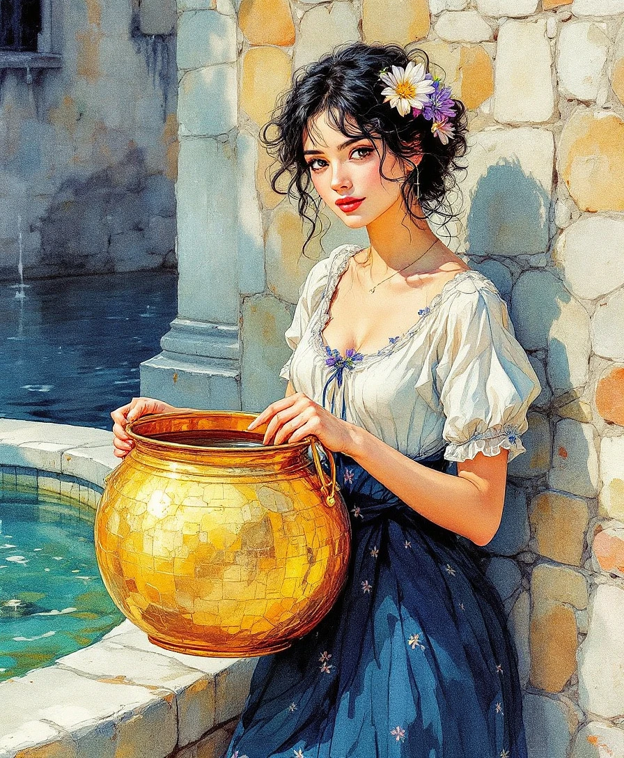 Masterpiece art, colorful mineral chinece Ink and pen craft rice paper Waltercolor, ink and pen, alcohol wash, dreamlike, pastels, Water carrier with a copper bucket at the fountain art by Kinuko Y. Craft, Frederick Carl Frieseke, Frances MacDonald, Ferris Plock, John Hejduk, Haroshi Masterpiece art in the style of Reylia Slaby Water carrier young Venetian Marta carries a gold-colored copper round bucket of water. She is tired of the road and the weight, and stopped to rest, leaning against the cool wall of the stone embankment. Young Marta is fresh, beautiful, full of Italian temperament, inspiration of youth, and faith in a bright future. Her beautiful dark hair curls in charming curls. She is dressed in light spring clothes made of different cotton fabrics with a small flower. She is wearing a blue draped petticoat with small purple flowers, a dark blue (almost black) cotton corset, and spring shoes with a low heel. She has a charming oval face with large eyes, thick eyelashes, and a charming smile. Marta slightly lifted the hem of her long dress with one hand so that a fresh breeze could touch her tired, beautiful, slender legs. She is slightly above average height. This is beautiful Venice of the 19th century, where life is harmonious and calm. People are happy, healthy, and friendly with each other. The city's stone architecture pleases the eye with its authenticity, and the nature is lushly attractive. Graceful cherry trees are blooming in the streets, white, red, and yellow roses are blooming in the flowerbeds near the fountains. The sky is clear and blue, a sea morning haze is in the air, 11 o'clock in the morning. vertical orientation of the painting. Marta in full growth. the color of the wall is dark, deep, luxurious blue)/Mercury Glass patima everything is skillfully drawn with ink, pen and bright, rich, multi-colored mineral paints