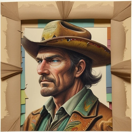 Very finely detailed 2-dimensional papar collage, featuring the face of a weatherworm western cowboy, close-up, The papers used to créate this collage are vintage and colorful, each piece shaped like an lizard