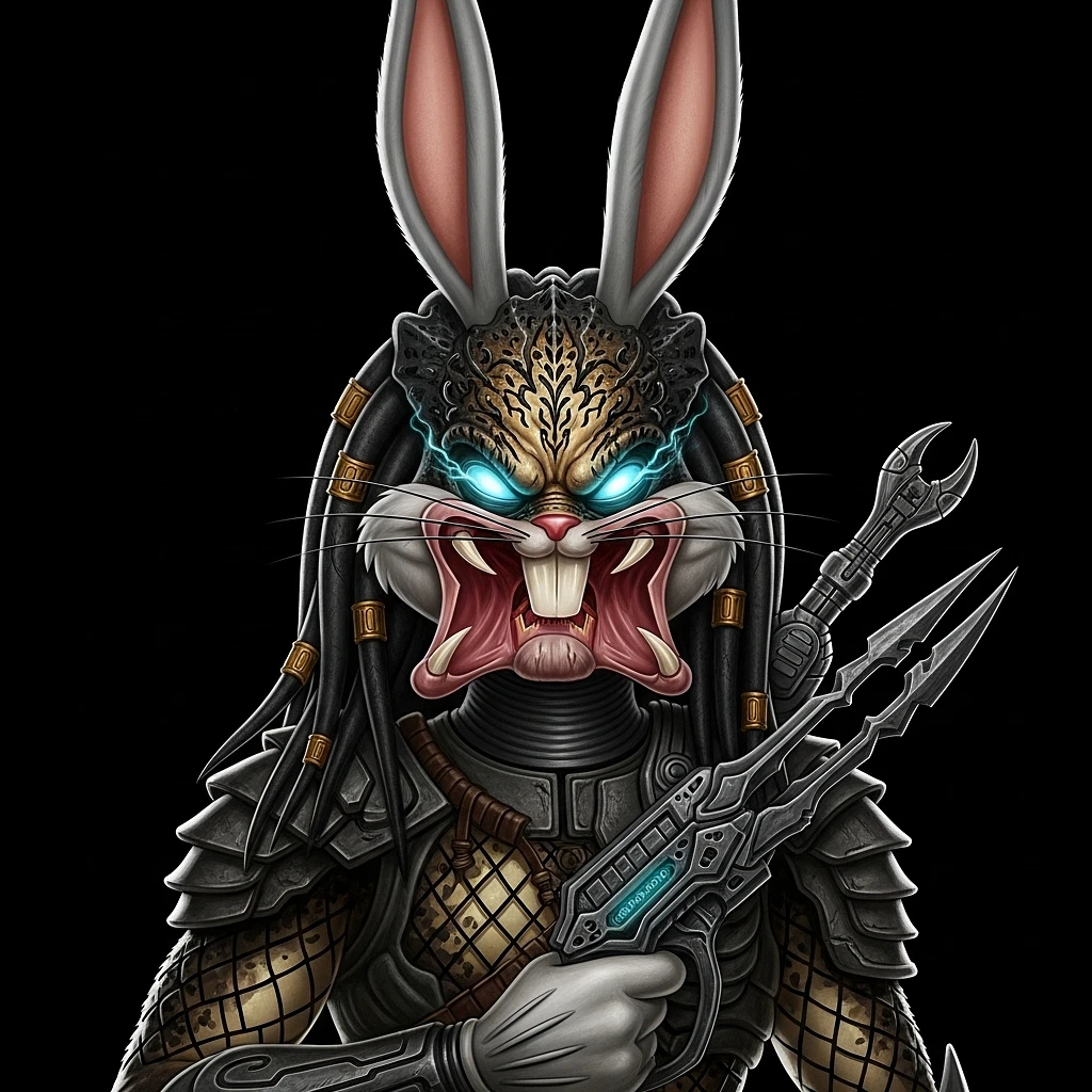 A high-resolution, photorealistic 2D illustration of Bugs Bunny transformed into a Predator. Bugs Bunny's iconic features (ears, buck teeth, general body shape) are merged with the Predator's characteristics: dreadlocks, mandibles, and advanced, organic-looking armor. The armor should be dark and textured, with subtle alien technological elements. His eyes glow with a menacing, alien light. He holds a stylized, extraterrestrial weapon. The art style is a dark, gritty fusion of classic cartoon and sci-fi horror. Very high quality. Plain black background. No text.