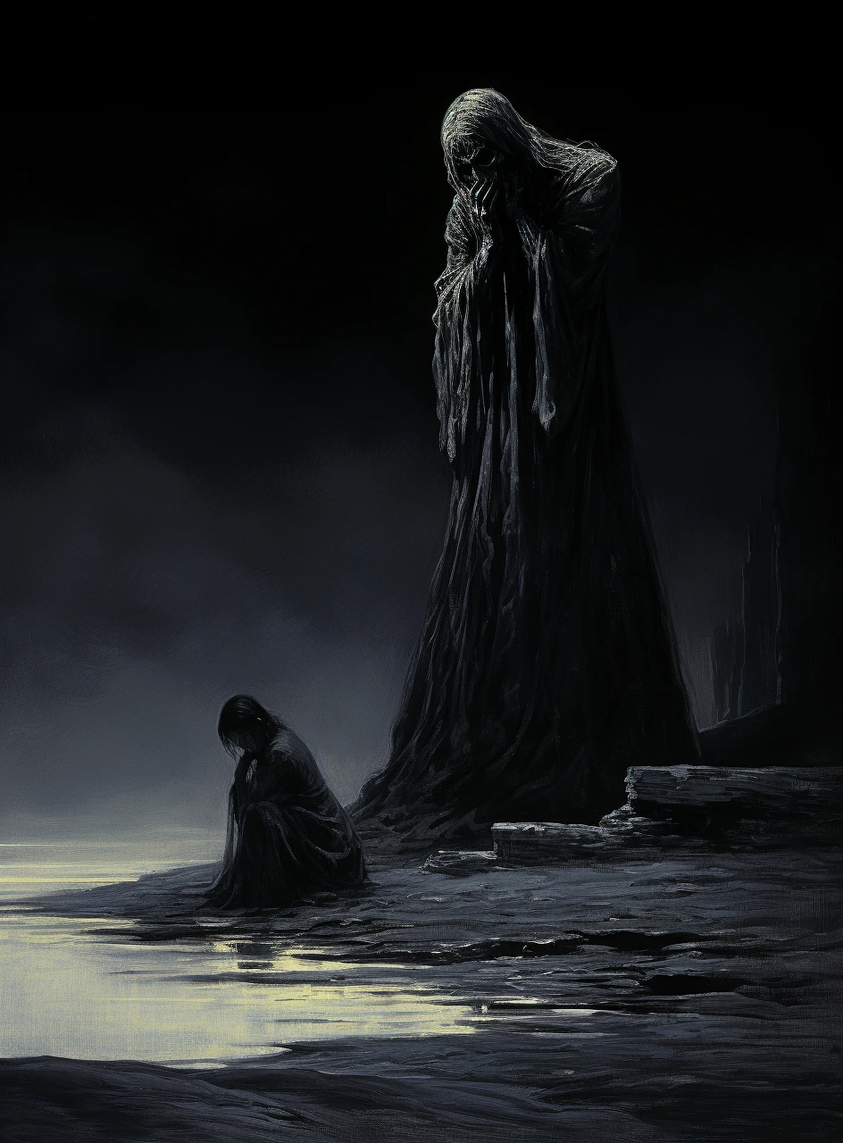 black and white illustration of the grim reaper standing over a terrified woman on her knees in a rocky beach at night, she has short hair with bangs and is wearing black dressy , dark fantasy style in the style of Gustave Doré and Zdzisław Beksiński --v 5. 2 --ar 47:64