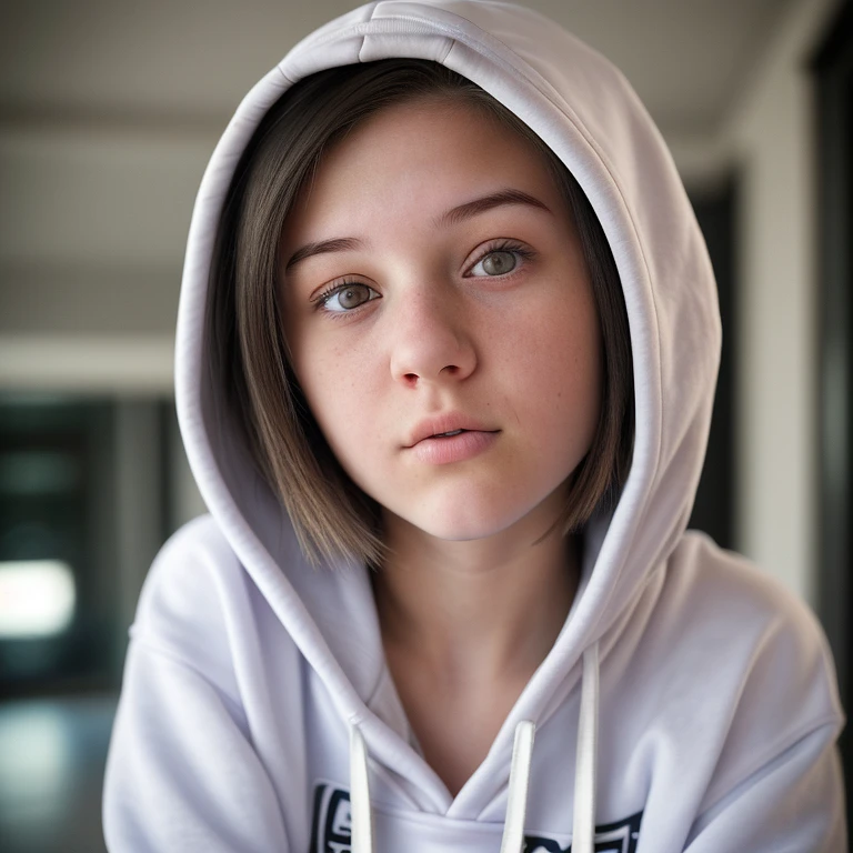 hyper realistic headshot photo of a 18 year old girl, wearing a hoodie, short hair, looking into the camera, Extreme Close-Ups, Full Frame camera, ISO: 100, Aperture (f-stop) : f/1. 8, Shutter Speed: 1/30, Camera Lens: 85mm prime lens, Camera Eye Line: Low, Studio Lightning