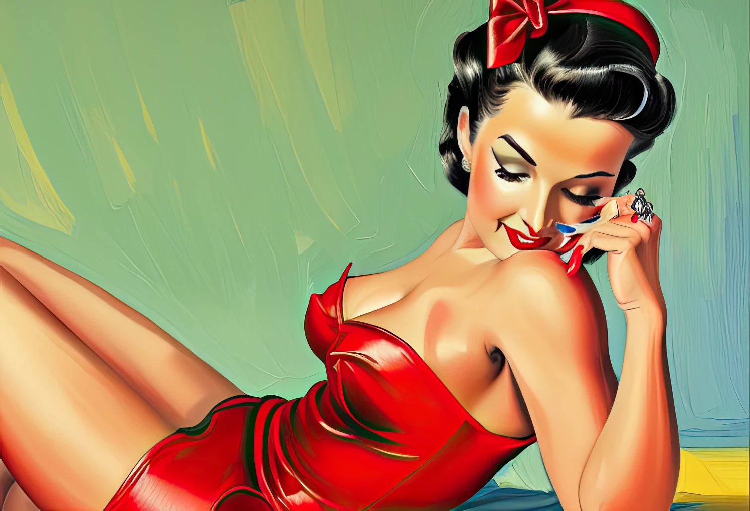 pin-up girl painting, medium-angle shot, high relief paint strokes, full body, beautiful hair, high heels