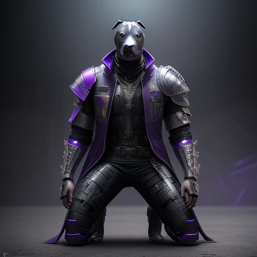 kneeling dog pitbull knight, hyperrealistic futuristic soldier dog wearing cyberpunk thanos jacket purple dark, portrait, finely detailed armor, intricate design, silver, silk, cinematic lighting, 4k, --ar 9:16