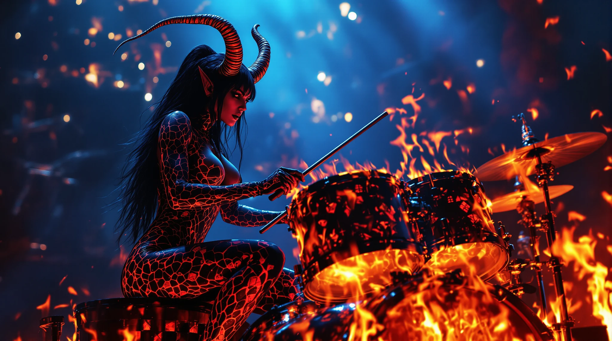 Two female demon characters on a dark concert stage: CHARACTER 1 - LAMAŠKATU (drummer) : A athletic female demon, and large, curved horns protruding from her forehead, shines under the intense spotlight of a rock music concert, her body painted with intricate, black and transparent snakeskin patterns accentuating her curves, she intensely plays a burning Tama drumset, her gaze fixed on the drums. Her long, black hair cascades down her back like a waterfall of night, reflecting the vibrant blue and red lighting effects that create an ethereal, radiant glow. CHARACTER 1 - LILITH (Frontwoman - Vocal) : Female red demon with large curved horns and glowing otherworldly presence Long raven black hair with sharp choppy bangs framing heart-shaped face Sleek black latex (!) outfit with snakeskin pattern that shimmers like obsidian Black latex boots, athletic physique Standing in powerful frontwoman pose, no instrument singing in a handhelt microphone The electric atmosphere is palpable, with warm, golden tones and subtle lens flare, reminiscent of a Kodak Ektar lens, capturing the raw energy and elegance of the performance. Inspired by the dark, mystical works of Zdzisław Beksiński and H. R. Giger, with the intricate, biomechanical details of Ashley Wood, the hyper-realistic 3D rendering style of Syd Mead, the atmospheric lighting of Roger Dean, and the majestic cinematic composition of Ash Thorp, this image is a fusion of mysticism, set against the high-energy backdrop of a live rock concert, with an air of mystical, otherworldly presence, as if the gods themselves have descended upon the temple, infusing the performance with an aura of dark, magical energy. The camera angle specifically captures her feets in the center of the frame, with the burning bassdrum prominently displayed. Her red snakeskin-patterned boots gracefully manipulate the pedals, center frame, while hellfire dances across the scene.