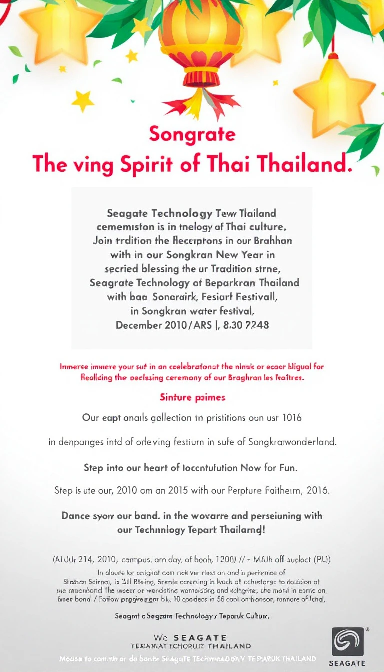 Immerse yourself in the vibrant spirit of Thai culture at Seagate Technology Teparuk Thailand! Join us for a unique blend of tradition and celebration as we commemorate the Songkran New Year with a special blessing ceremony at our Brahma shrine, followed by a lively Songkran water festival. Experience the rich cultural heritage of Thailand as our employees, dressed in traditional attire, participate in a sacred blessing ceremony at our revered Brahma shrine. Witness the heartfelt prayers and offerings as we seek blessings for the year ahead. Step into the heart of the Songkran festivities as we transform our campus into a water wonderland! Join the fun as we engage in the playful tradition of water splashing, symbolizing the washing away of bad luck and welcoming in a year of prosperity. Dance to the rhythm of traditional Thai music as our live band sets the mood for a day of celebration. Embrace the spirit of Songkran as we revel in the joy of togetherness and create lasting memories. Don't miss this opportunity to experience the unique blend of culture and celebration at Seagate Technology Teparuk Thailand. Join us for a day of blessings, fun, and unforgettable memories!