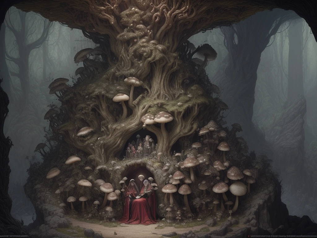 many mushroom people, intricate, realistic faces, detailed portrait, detailed faces, insanely detailed, vivid color, trending on artstation, 4k, hyper realistic, focused, extreme details, cinematic, masterpiece, a digital concept art by gustave dore and greg rutkowski, trending on artstation. dante's divine comedy, dark fantasy cave palace of bad omens, a iron throne, white stone steps seeping magma. fier in fog. light effect. 3 d, octane render, unreal engine. mist.