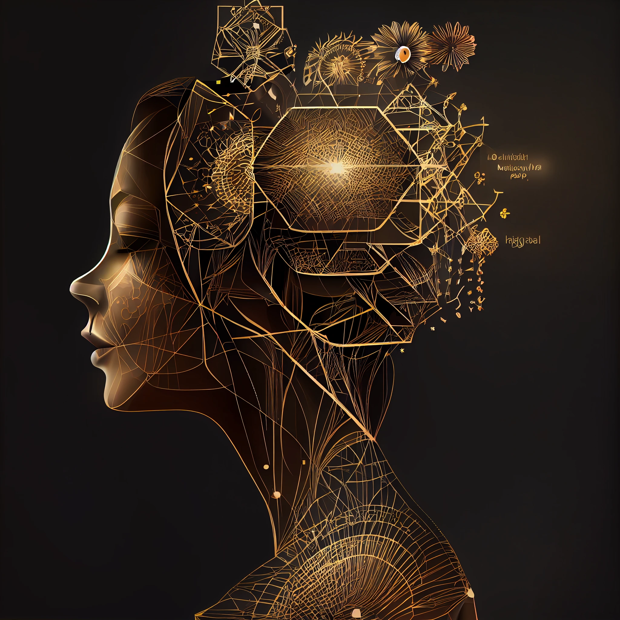 Incredibly detailed technical diagram of the profile of a woman with the top and back of her head split into complex geometric shapes and flowers growing from the shapes, Chiaroscuro lighting, fine intricate details --q 2 --upbeta --v 4 --v 4
