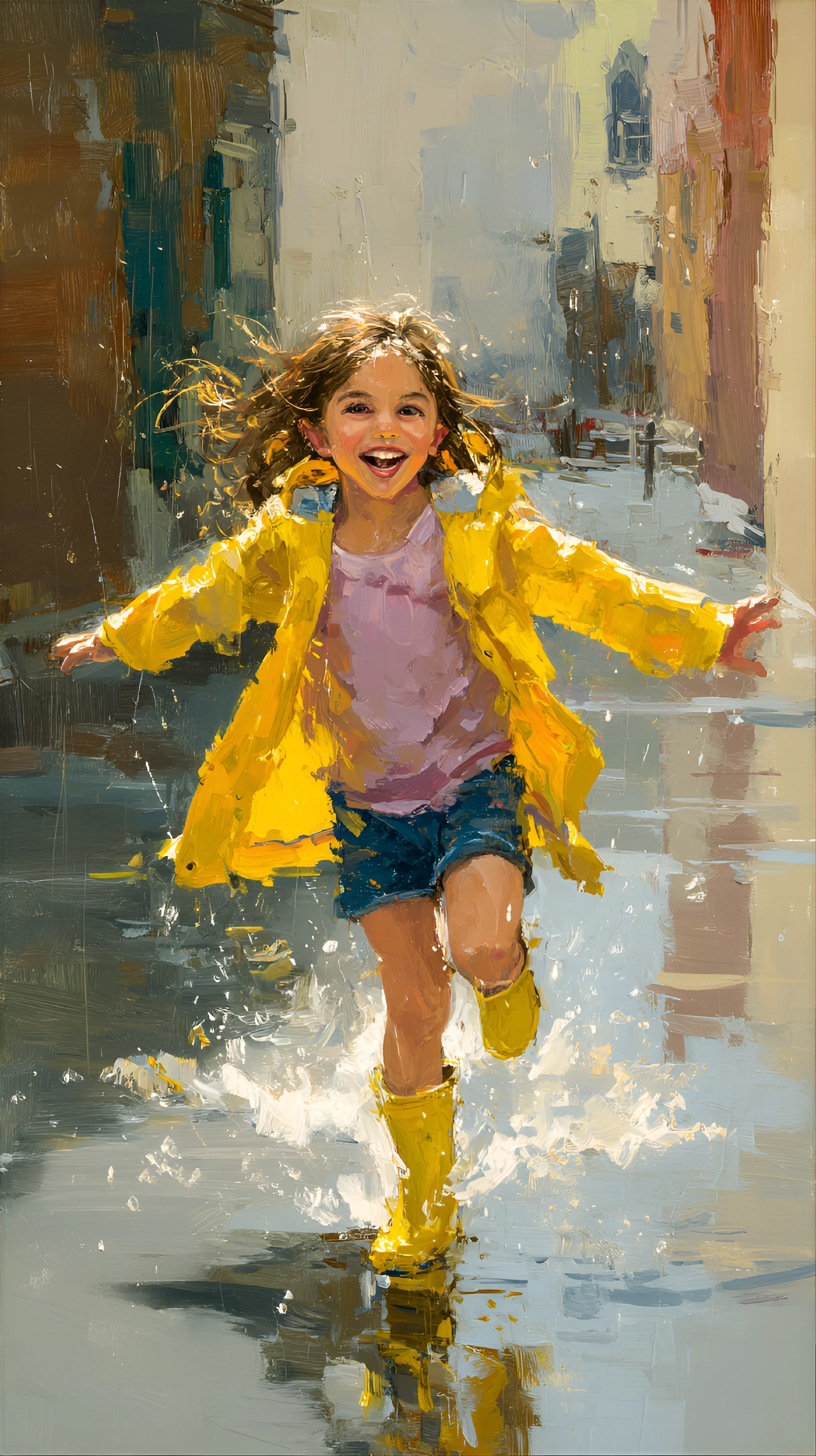 young girl, likely 4-6 years old, of light complexion, is joyfully leaping in puddles on a city street. She wears a bright yellow raincoat, light-pink t-shirt, and denim-blue shorts. Her hair is brown and flowing, with some droplets of water. She is wearing bright yellow rubber boots. The girl has a happy, open-mouthed expression, and her body is angled diagonally across the image, landing in a puddle, her arms outstretched. The environment is a city street on a rainy day. Water puddles are prominent on the street, and water droplets are falling and splashing around her. The buildings in the background are out-of-focus, showing a variety of muted colors