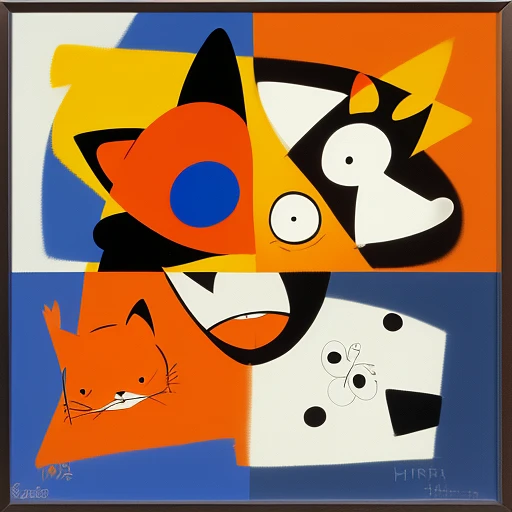 Cute fox , cartoon illustration, joan miro, henri matisse and herman brood, oil on canvas, impasto, red blue orange yellow black white, graffiti, conceptual art, cinematic, illustration, poster