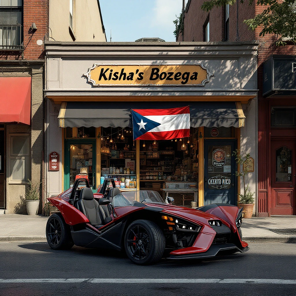 A spanish style storefront of a bodega IN A NEW YORK STYLE NEIGHBORHOOD. A black and red Slingshot car is parked in the street in front of the store. The store is Decorated with a puerto rico flag. It says "Kisha's Bodega", natural sunlight, cinematic, hyper realism, high detail, octane render, 8k