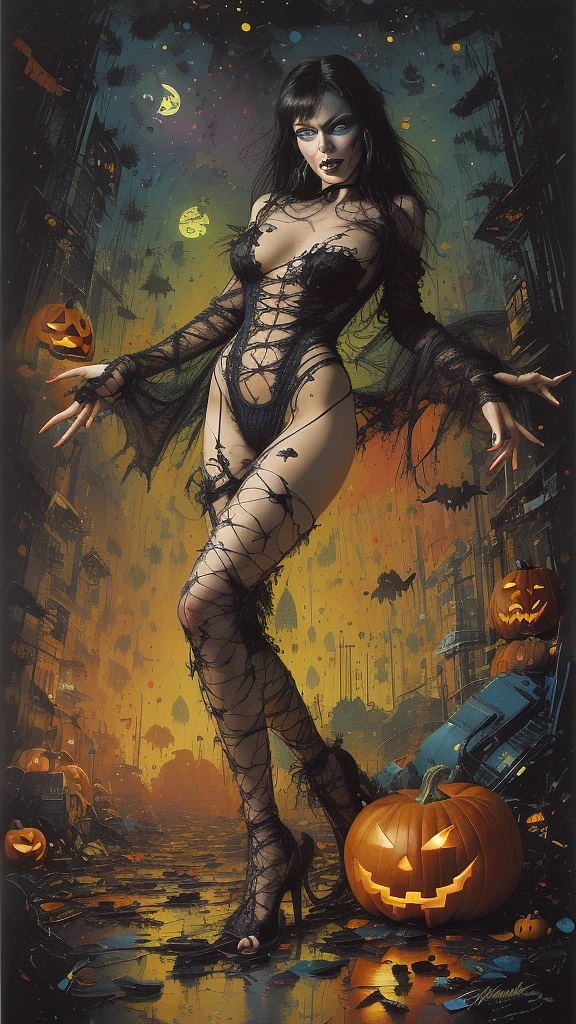 (4k masterpiece) (best quality) (ultra-detailed) (best illustration) flawless by John Berkey seductive face colorful halloween slinky horror art