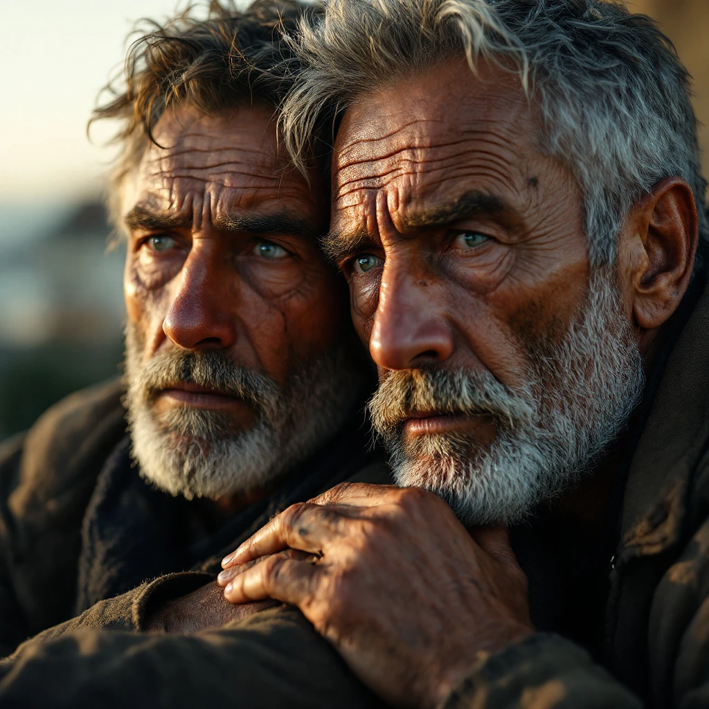 A hyper-realistic close-up portrait of two close friends in their late 30s to 50s, sitting shoulder to shoulder, eyes looking in different directions, one quietly emotional with a subtle tear, the other steady and calm, hands resting between them, visible signs of a shared difficult past — weathered skin, scars, stubble, worn clothing. Soft golden-hour lighting brushing their faces, out-of-focus background suggesting an urban rooftop or quiet landscape. Deep emotional connection, subtle storytelling through expression, cinematic realism, modern album cover aesthetic --v 6 --ar 4:5 --style photographic --q 2 --style raw