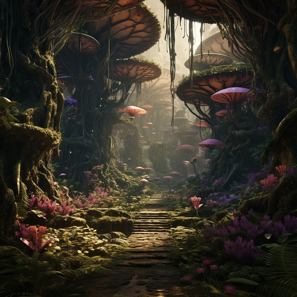 captivating neverending rainforest made of wonderland, variety of alien flora and fauna, high detail, 4k, raytracing, masterpiece, wide shot, sharp focus, photo, digital art, fantasy::, the dark crystal movie style::