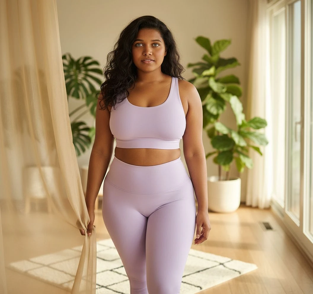 A photorealistic image of a stunning and curvaceous 21-year-old woman with glowing skin, long wavy hair, and captivating eyes. She stands hidden behind a silky curtain in a luxurious room filled with natural light. The image captures the moment she drops the curtain to reveal a sleek, form-fitting yoga outfit—a matching sports bra and high-waisted leggings in a soft pastel color that hugs her voluptuous curves, emphasizing her ample chest, narrow waist, and rounded hips. The background features lush indoor plants, a plush yoga mat, and warm sunlight streaming through large windows. Shot with a Canon EOS 5D Mark IV and a 50mm lens, the scene is illuminated by soft, diffused lighting with sharp details, cinematic depth, and rendered in 4K resolution.