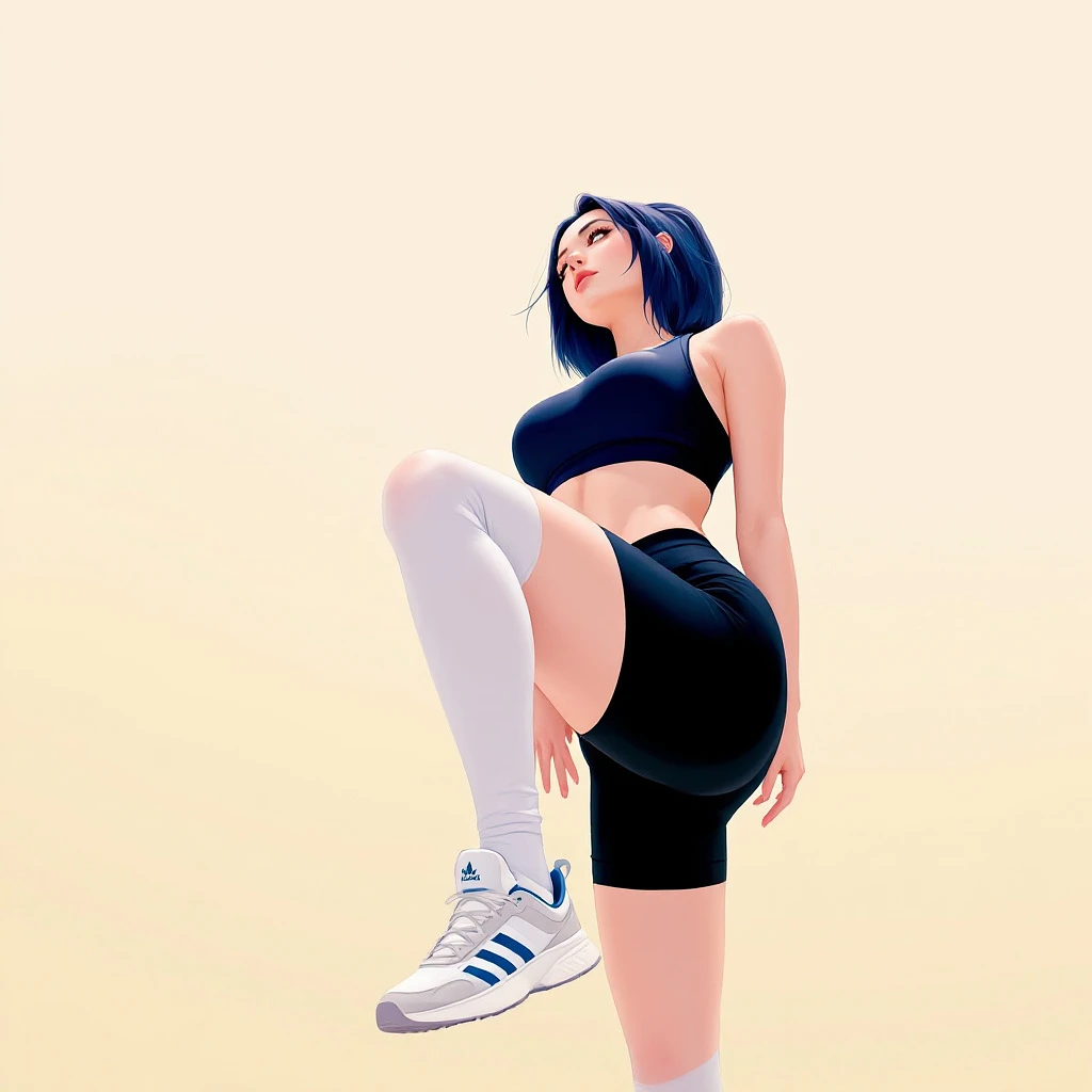 masterpiece, best quality, amazing quality, very aesthetic, absurdres, newest, scenery, high-resolution, digital illustration, highly detailed, digital art, anime, digital art, a woman, female, sui-feng, bleach, navy hair, brown eyes, athletic wear, dark blue sports bra, cleavage, midriff, navel, tight shorts, dark blue shorts, thighhigh socks, white sneakers, blue lining, adidas logo, on one knee pose, hand on knee, looking away, beige background, gradient background, from below, medium depth of field, rule of thirds, high aesthetic quality, smooth shading, detailed textures, clean lines, sharp edges, minimalistic composition, masterpiece, best quality, amazing quality, very aesthetic, absurdres, newest, scenery