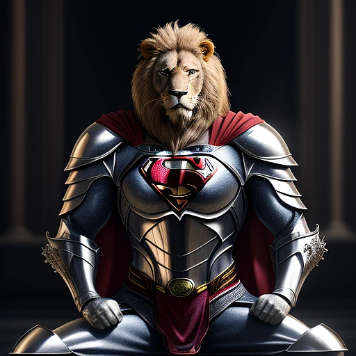 kneeling superman lion knight, portrait, finely detailed armor, intricate design, silver, silk, cinematic lighting, dramatic lighting, 4k