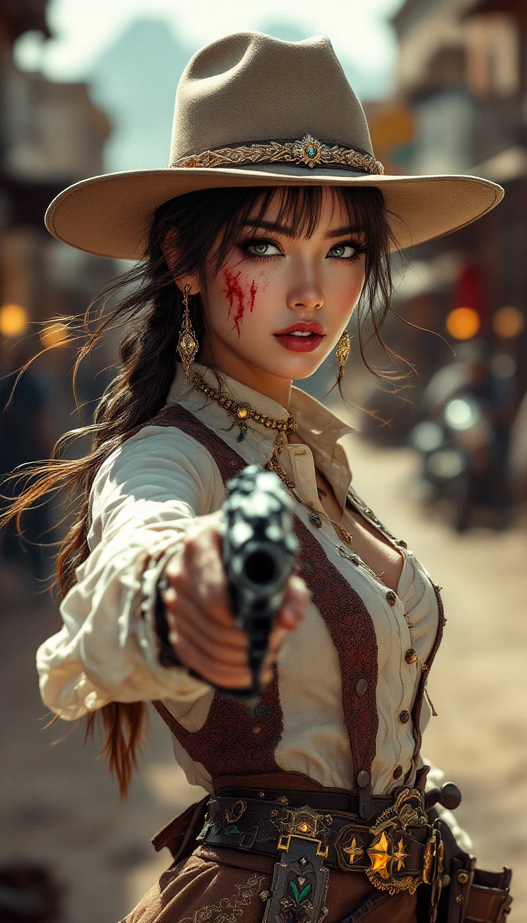 Hyper realistic, photo realism, High Contrast, insanely detailed and intricate, elegant, ornate, super detailed zoomed out full body view HD Photo of beautiful Chinese female old west sheriff. She is standing in the street of an old western town, She is in a gun fight with two wanted outlaws trying to leave town. She has her revolver drawn in her right hand and is shooting at the outlaws. She has killed one outlaw, he lays face down in the street. The other outlaw is trying to get on a horse, She has been struck by one of the outlaws bullets and is bleeding. She has a stone cold and determined look on her face. Her eyes are fixed on the remaining outlaw. She shoots him as he reaches for his other gun. She has colorful Native American arm tattoos, blonde hair with bangs, dark blue eyes framed by long, elegant eyelashes and ornate eyeshadow that compliments her eyes. She wears an flat top brimmed hat with the brim level with her eyes, her hair is blowing in the breeze. She is wearing Mexican style poncho with a sheriff's badge, and a ragged mini shirt. She is wearing an ornate gold and onyx belt and choker, and dusty square toed cowboy boots with silver spurs. The street is dark, there are dim lanterns along the buildings casting dim light. it is night time, there are dark clouds rolling in on the night sky on the Reddish Orange sunset in the background. No poorly formed fingers, no extra arms, no extra legs, no extra fingers, no poorly formed hands, no poorly drawn body, no poorly drawn teeth, no bad anatomy.