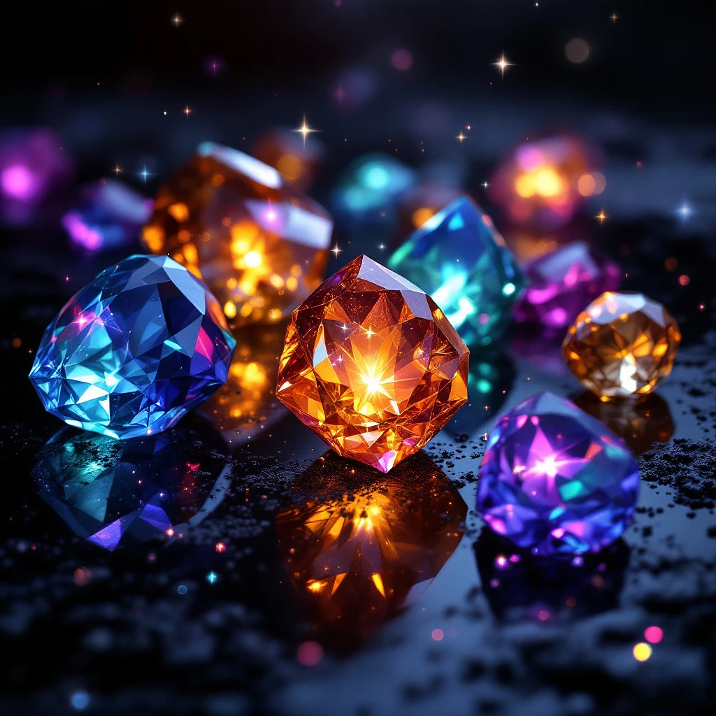 A digitally enhanced image of a collection of gemstones, creating a mesmerizing and luxurious scene. The gemstones are glowing with an inner light, casting vivid reflections and refractions on a sleek black surface that looks like polished obsidian. Each gemstone exudes a magical aura, with ethereal wisps of light swirling around them. The ambiance is elevated with sparkling micro-crystals suspended in the air, giving the impression of a mystical treasure trove. The overall atmosphere is otherworldly, with a rich color palette that enhances the deep hues of the gemstones and contrasts with the dark background. robiness. masterprompter.