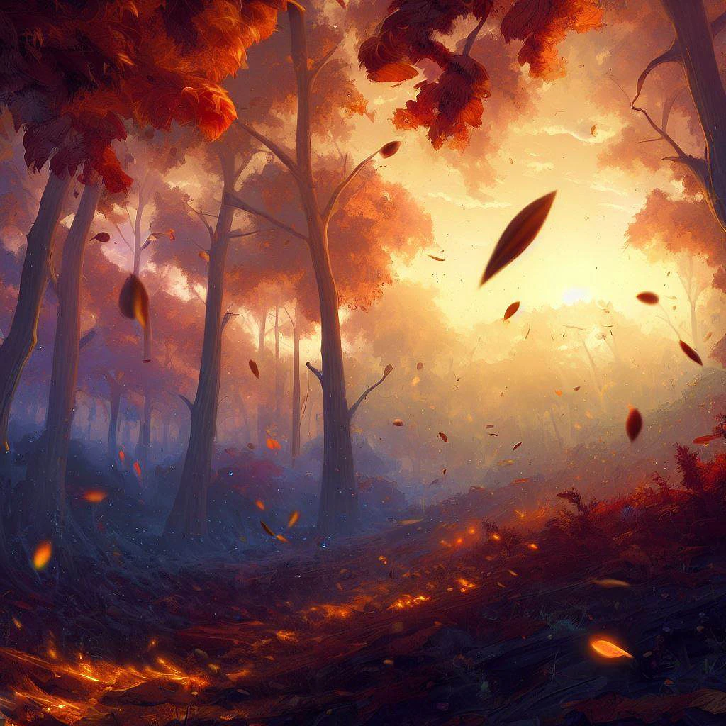 Autumn forest with leaves falling at sunset, high-fantasy. professional canvas by greg rutkowski, joe madureira, jody bergsma and boris vallejo, triadic colors, deep color, dynamic lighting, volumetric lighting, shading with dark edges, richly detailed, matte background, enameled glass, style octane render at 4k resolution